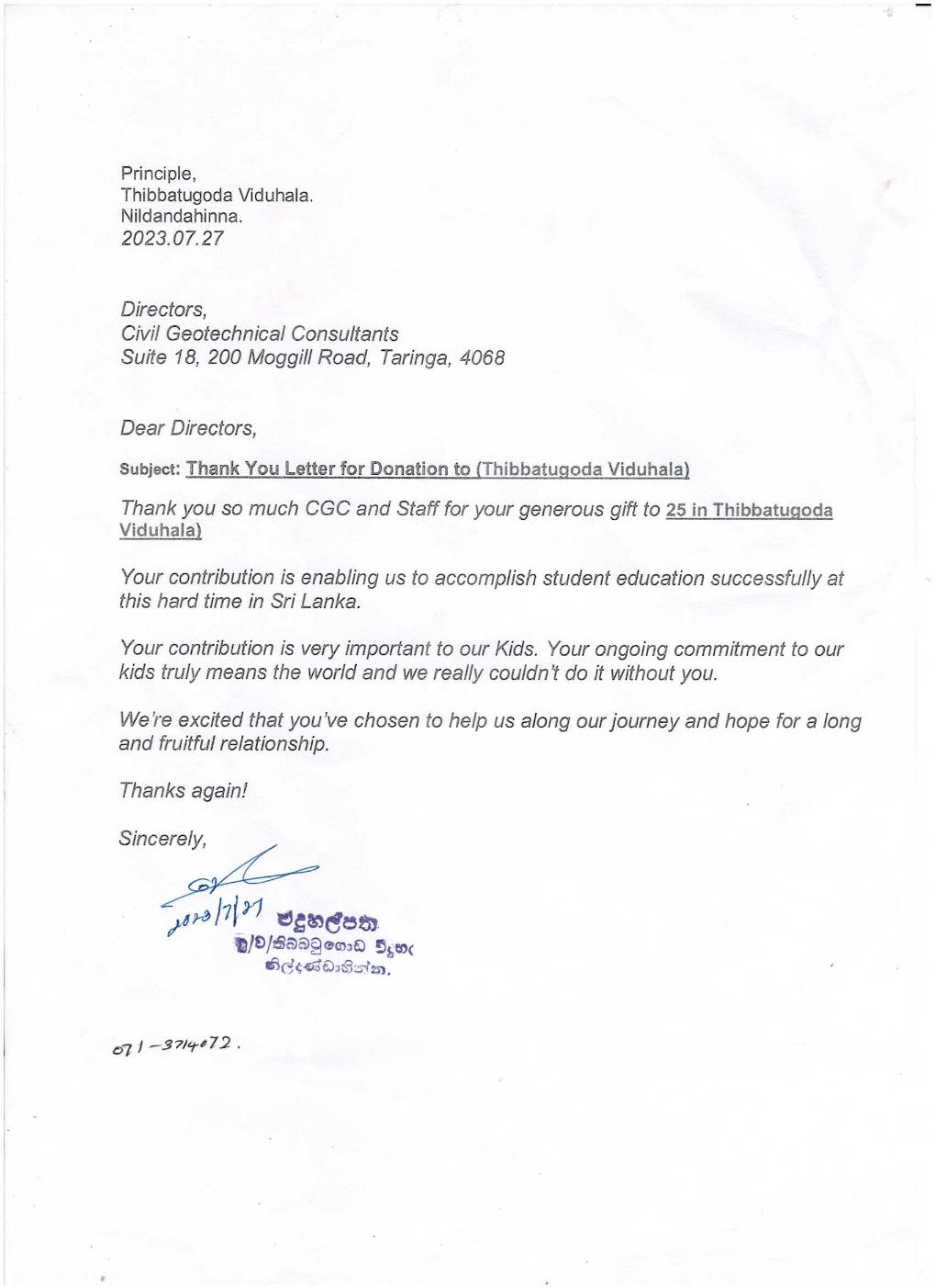 Donors Project Details Code: 2023-03 School Name: Thibbatugoda Vidyalaya Project Date: 27 July 2023 Village: Thibbatugoda District: NuwaraEliya Province: Central No of Students: 25 Totla Fund: 80,631.63 LKR Doner: CGC Thank you! Thank you letter Share this Post Leave a comment Success! Your message has been sent to us. Error! There was an error sending your message. Full Name Email Address Subject Message Style SwitcherCheck out different color options and styles.