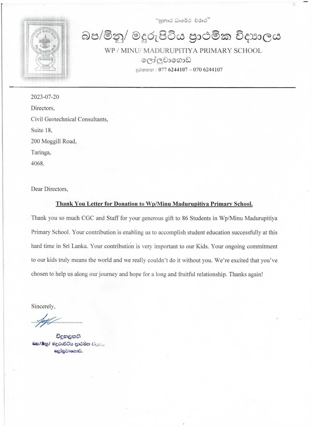 Donors Project Details Code: 2023-05 School Name: Madurupitiya Primary School Project Date: 20 July 2023 Village: Madurupitiya District: Gampaha Province: Western No of Students: 86 Totla Fund: 277,372.81 LKR Doner: CGC Thank you! Thank you letter Share this Post Leave a comment Success! Your message has been sent to us. Error! There was an error sending your message. Full Name Email Address Subject Message Style SwitcherCheck out different color options and styles.