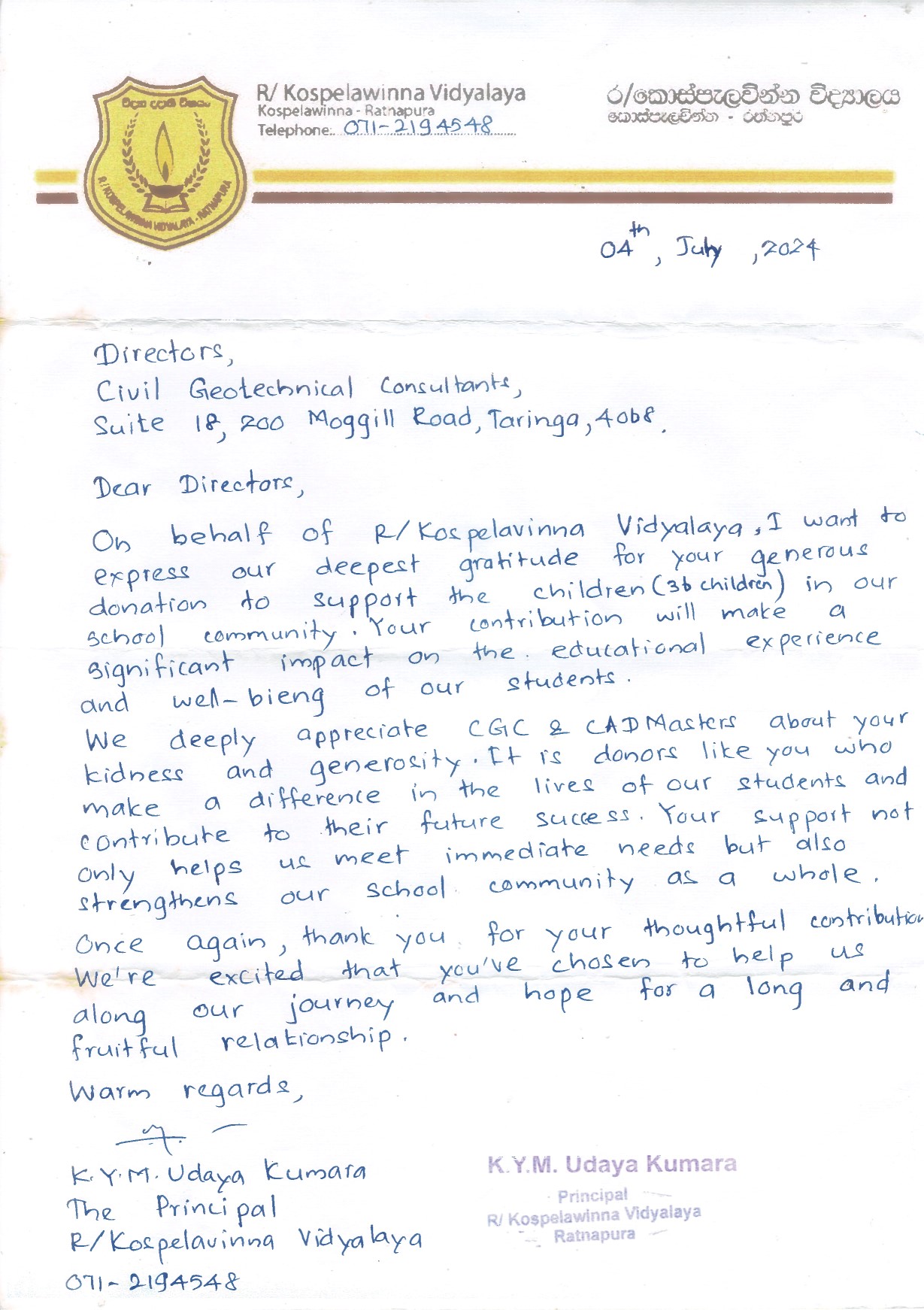 Donors Project Details Code: 2024-12 School Name: Kospelavinna Viddyalaya Project Date: 04 July 2024 Village: Kospelavinna District: Ratnapura Province: Sabaragamuwa No of Students: 36 Totla Fund: 115,043.40 LKR Doner: CGC Thank you! Thank you letter Share this Post Leave a comment Success! Your message has been sent to us. Error! There was an error sending your message. Full Name Email Address Subject Message Style SwitcherCheck out different color options and styles.